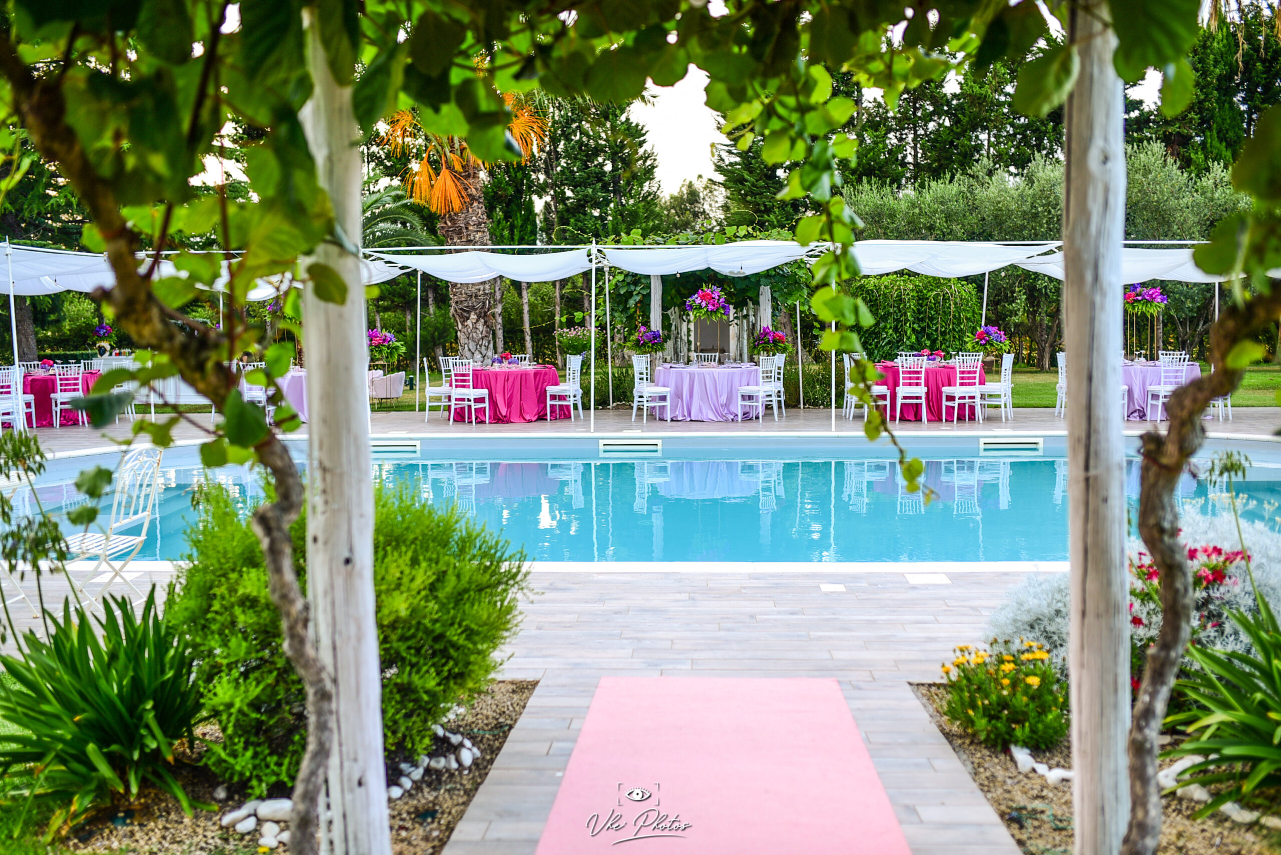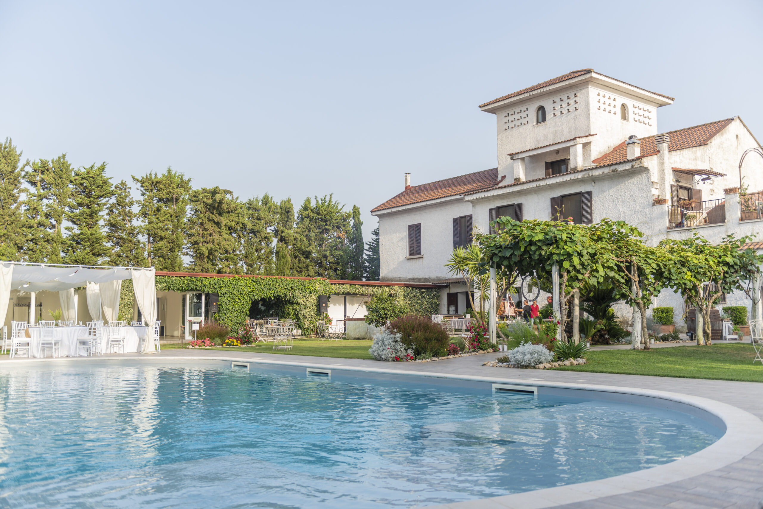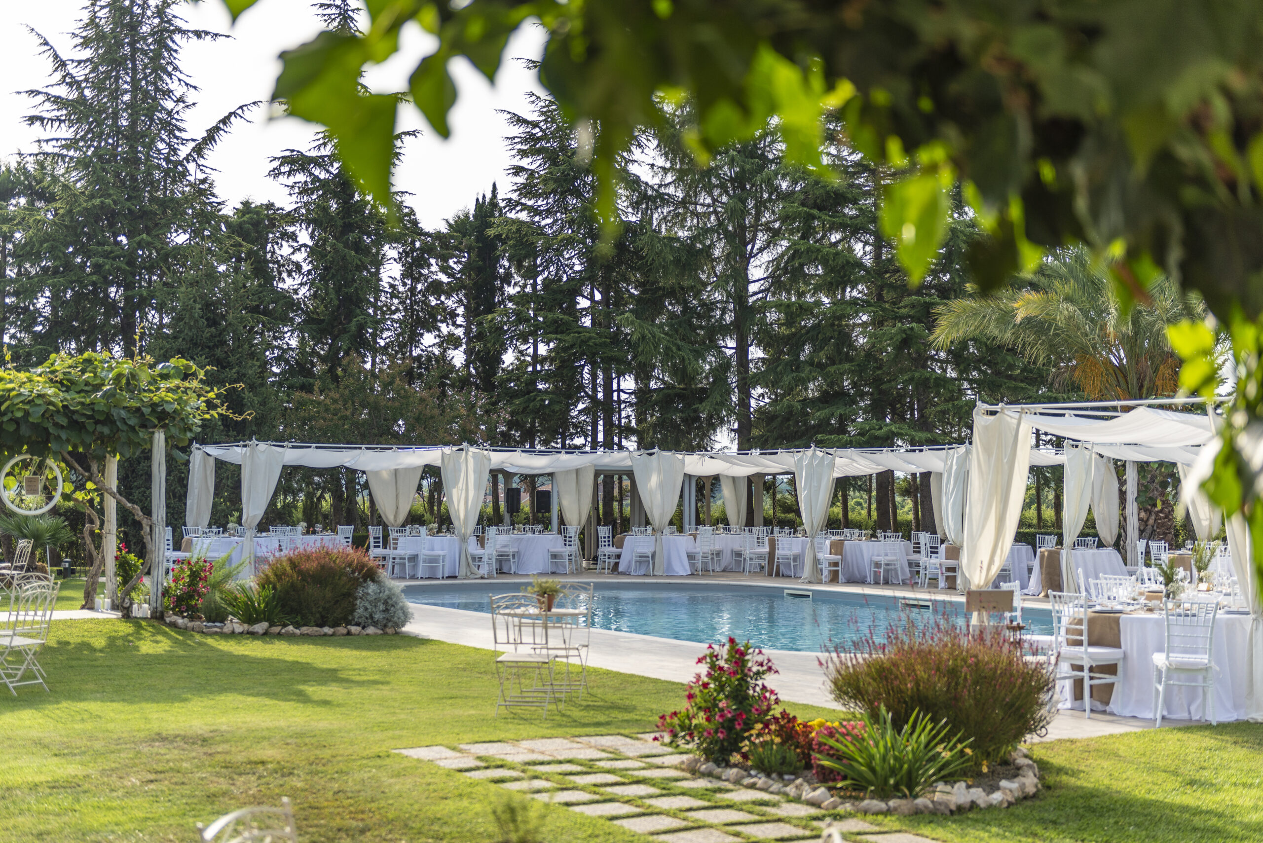 La piscina della Masseria, incastonata nel verde e perfettamente integrata nel contesto naturale, aggiunge un tocco di freschezza e raffinatezza agli eventi.