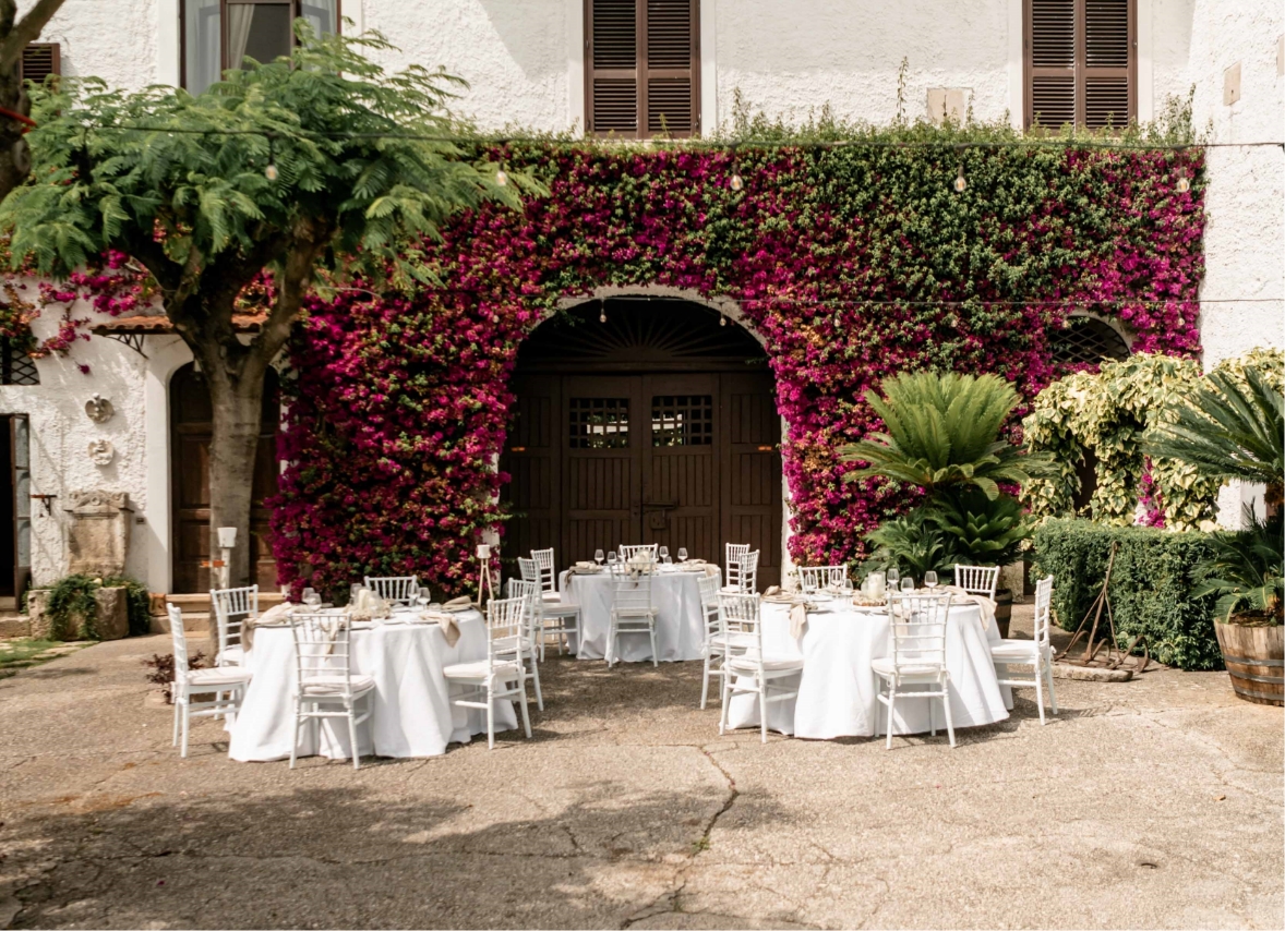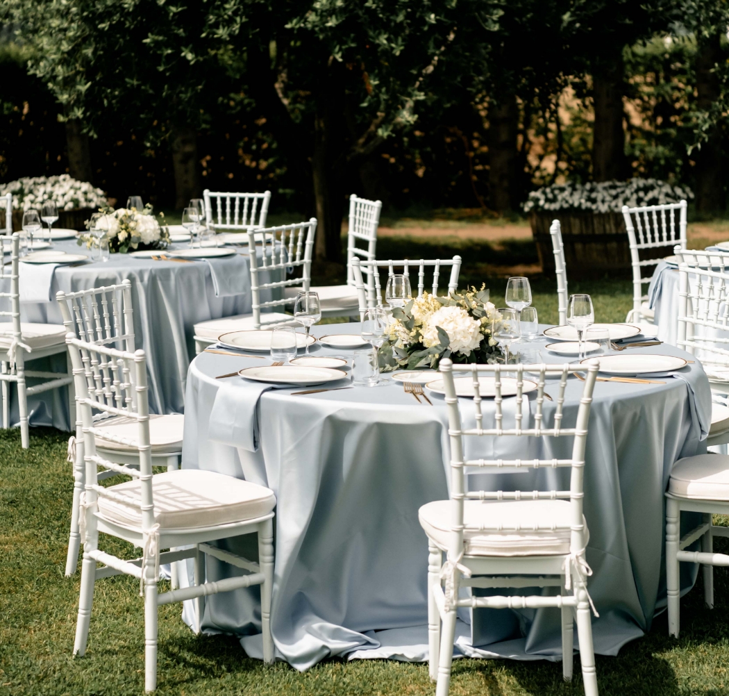 Utilizziamo tovagliato neutro, senza colori accesi, per creare un’atmosfera sobria ma accogliente, lasciando spazio alla luce e alla bellezza della location.